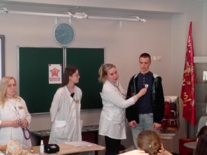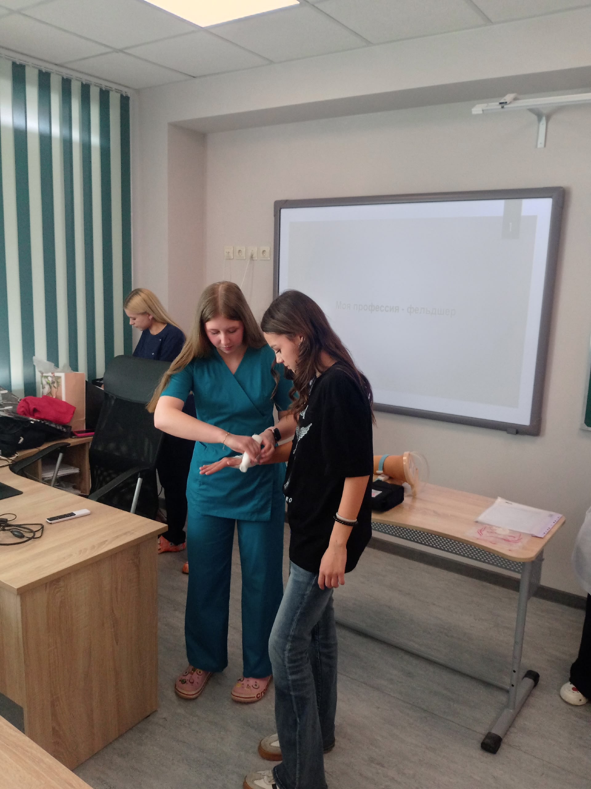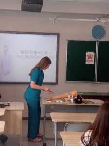 В ходе встречи студенты продемонстрировали некоторые медицинские манипуляции, что вызвало живой интерес у школьников. Участники увидели, как проводится перевязка раны, измерение артериального давления и другие основные процедуры.