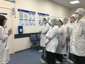 В рамках экскурсии студенты посетили лабораторию, где ознакомились с методами микробиологической диагностики (микроскопия, посевы, ПЦР-диагностика), а также кабинеты приема пациентов и процедурный кабинет.