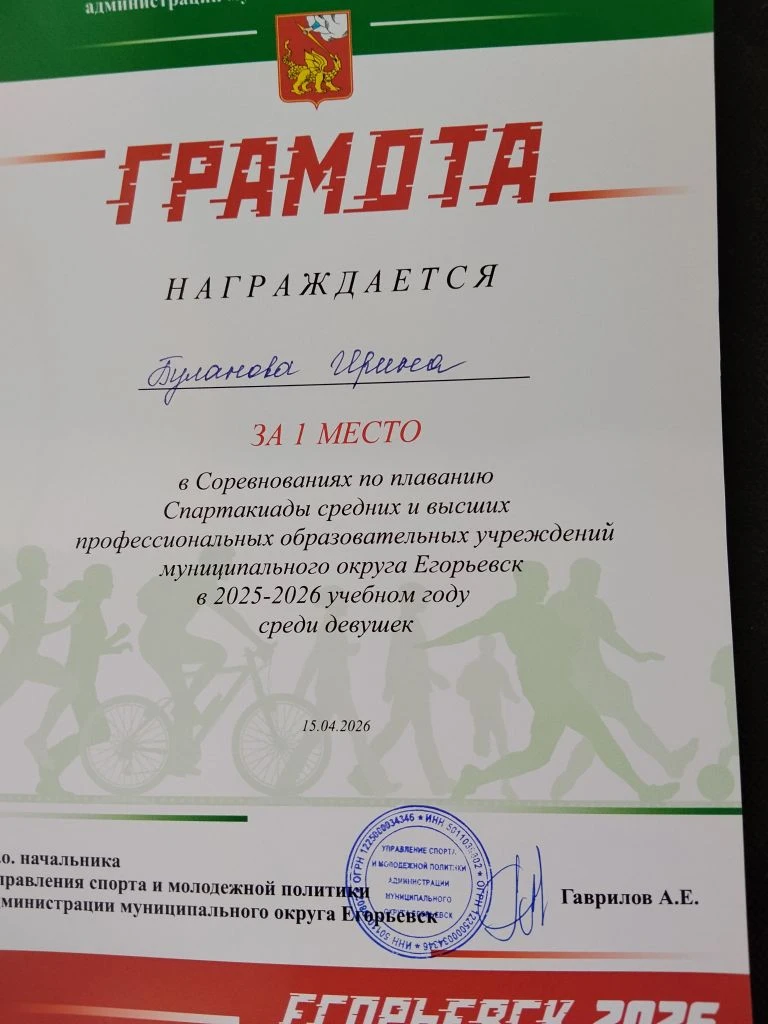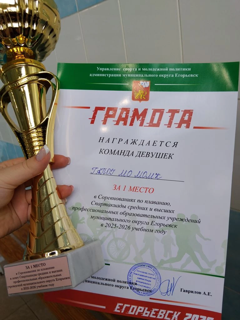 По итогам соревнований команда девушек заняла 1 место в рамках Спартакиады средних и высших профессиональных образовательных учреждений муниципального округа Егорьевск в 2025–2026 учебном году.